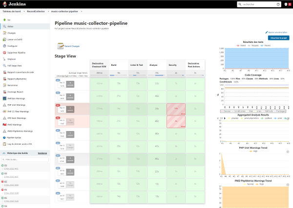 At the end, a Jenkins pipeline page looks like this. I can access all the report I have generated in the left section. I have build history on the middle and time series graph on the right to help me see evolution over time.